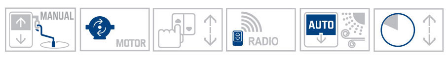 Működtetés: időjárás érzékelő: szél, nap+szél, nap+szél rádió adóval, távirányító adó-vevő, nap+szél+eső rádió adóval, iránykapcsoló