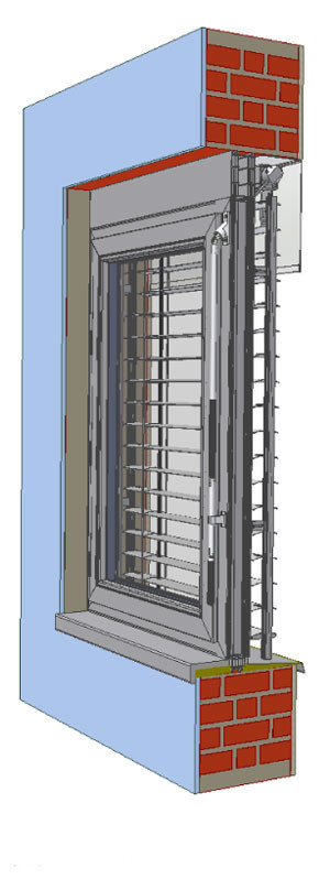 Zsaluzia megvezetése: szimpla lefutó sín 20×18, szimpla lefutó sín falba 20×18, vakolható lefutó sín, persely nélkül, dupla lefutó sín ELOX, RAL 9006, acél zsinór