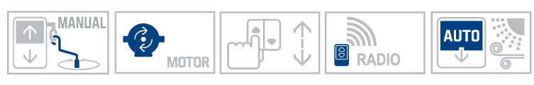 motoros: egyfázisú motor 230 V 50 Hz, hőkapcsolóval, felső profilba építve, elektromos kapcsolóval az alsó és felső véghelyzethez
